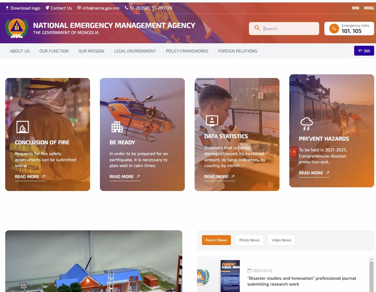 Онцгой байдлын байгууллагын nema.gov.mn цахим хуудсыг орчин цагийн техникийн шинэчлэл, цаг үеийн хэрэгцээ, шаардлага, иргэдийн хүсэл сонирхолд нийцүүлэн монгол, англи, монгол бичгийн хувилбартайгаар шинэчилж, гар утсаараа бүх төрлийн мэдээллийг нэг дороос авах боломжийг бүрдүүллээ.