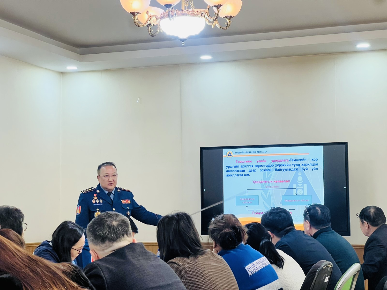 Сургалтаар гамшгийн үеийн шуурхай үеийн шуурхай удирдлага зохион байгуулалт, гамшгийн нөхцөл байдал, гамшгаас хамгаалах команд штабын сургуулийн зохион байгуулалт, үйл ажиллагаа, гамшгаас хамгаалах төлөвлөлт, бэлэн байдал, гамшгаас хамгаалах улсын алба, мэргэжлийн ангийн дүрэм, байр зүйн зураг зэрэг сэдвийн хүрээнд мэдээлэл хийсэн юм.