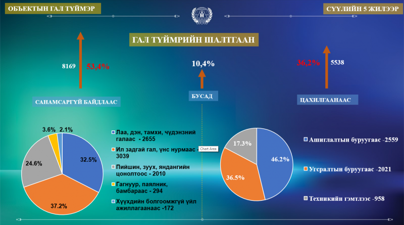 Сүүлийн 5 жилд гарсан объектын гал түймрийн 8169 удаа буюу 53,4% иргэний санамсаргүй байдлаас, 5538 удаа буюу 36,2% цахилгаанаас, 1591 удаа буюу 10,4% бусад шалтгаанаас үүдэн гарсан байна.