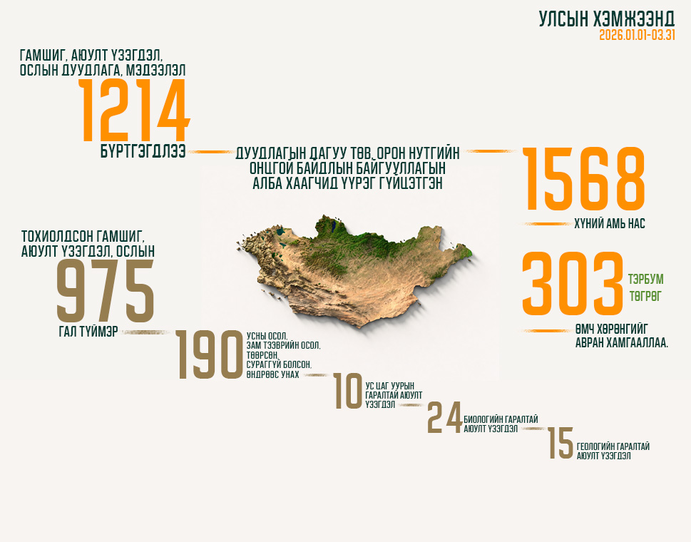 Улсын хэмжээнд он гарсаар (2026.01.01-03.31) гурван сарын байдлаар 1214 удаагийн гамшиг, аюулт үзэгдэл, ослын дуудлага, мэдээлэл бүртгэгдлээ.