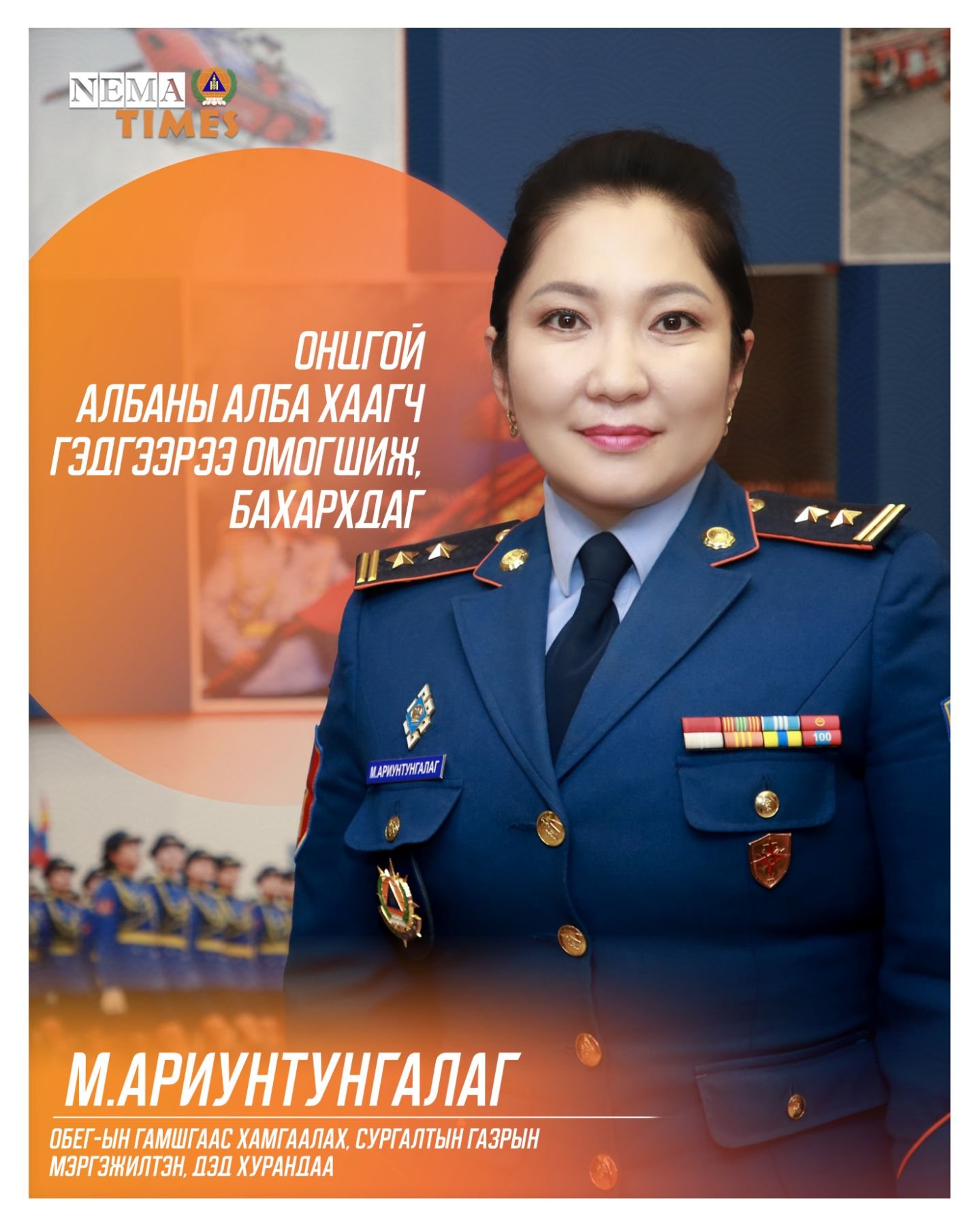 nematimes булан ОБЕГ-ын Гамшгаас хамгаалах, сургалтын газрын гамшгаас хамгаалах сургалт, дадлага хариуцсан мэргэжилтэн, дэд хурандаа Мягмарын Ариунтунгалагийг онцолж байна.