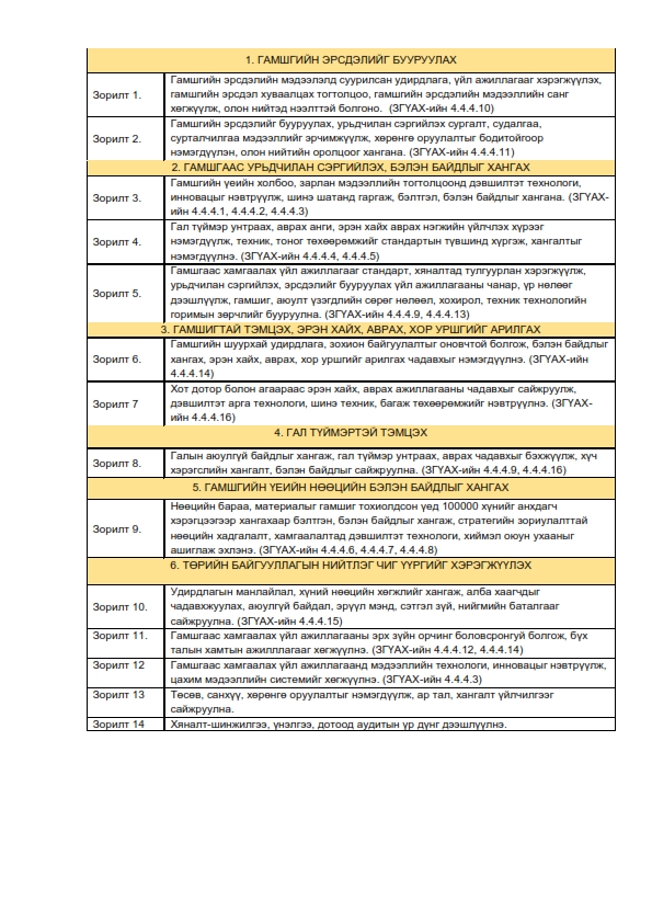Гамшгаас хамгаалах, сөрөн тэсвэрлэх чадавхыг бэхжүүлж, иргэдийн аюулгүй орчинд амьдрах нөхцөлийг бүрдүүлэх замаар Монгол Улсын үндэсний аюулгүй байдал, тогтвортой хөгжлийг хангахад дэмжлэг үзүүлнэ.