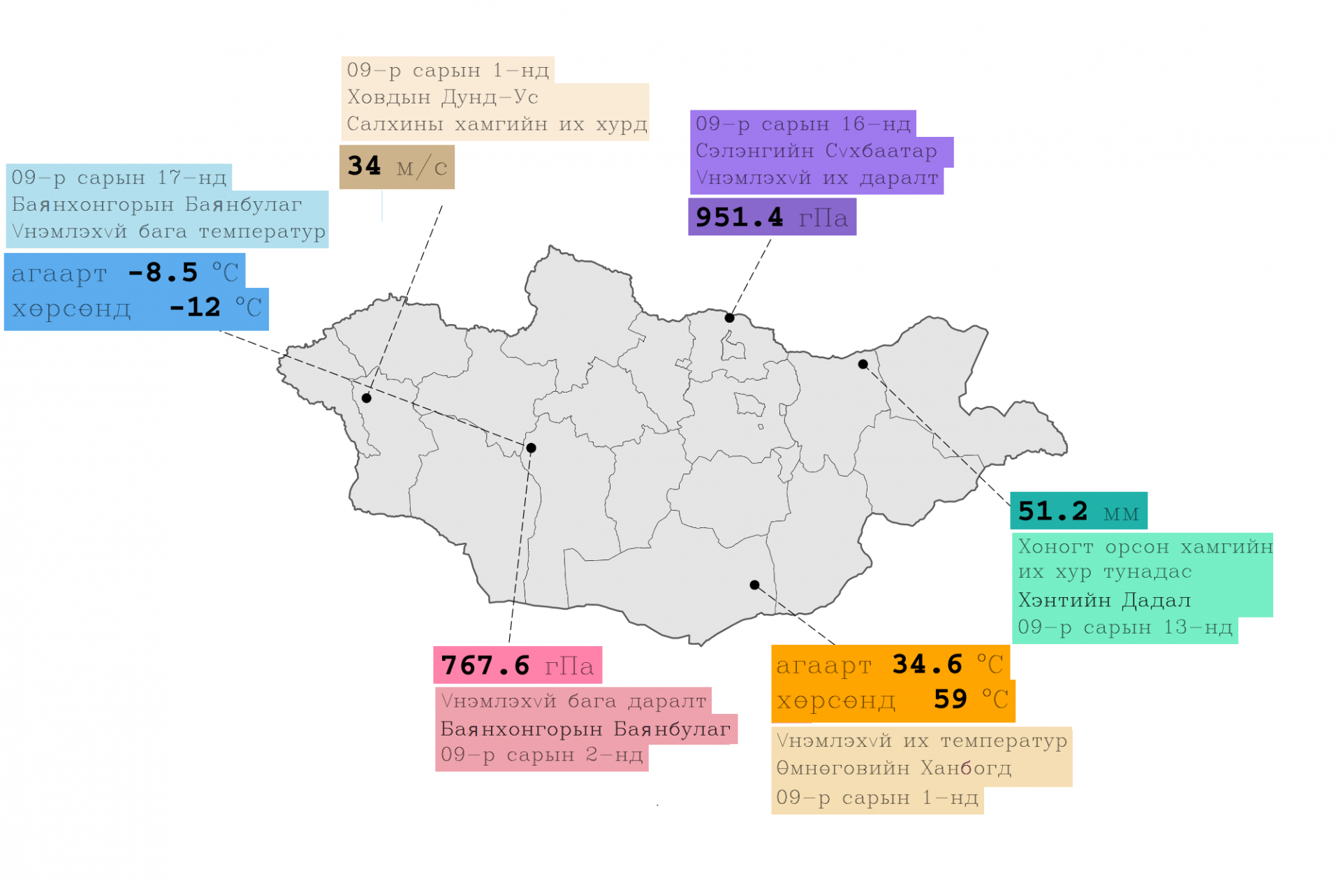 Өнгөрсөн есдүгээр сарын агаарын дундаж температур өмнөх жилээс 0.6°С-аар, олон жилийн дунджаас 0.9°С-аар тус тус дулаан байсан ба 1940 оноос хойш тохиолдож байгаа 10 дахь дулаан сар болж өнгөрлөө.