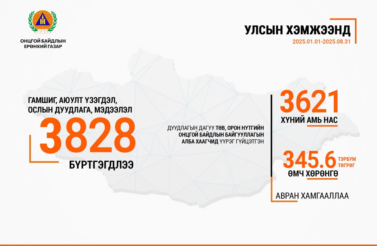 Шинэ мэдээУлсын хэмжээнд он гарсаар найман сарын байдлаар 3828 удаагийн гамшиг, аюулт үзэгдэл, ослын дуудлага, мэдээлэл бүртгэгдлээ.