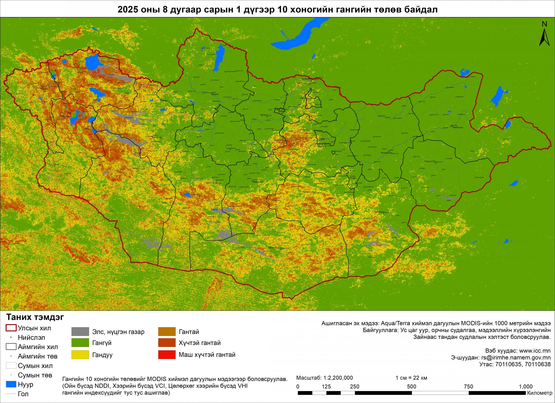 Шинэ мэдээҮнэлгээгээр наймдугаар сарынн 10-ны өдрийн байдлаар Баян-Өлгий, Увс, Ховд, Завхан, Говь-Алтай, Дундговийн ихэнх, Баянхонгор, Өвөрхангай, Төв, Дорноговийн зарим, Сэлэнгэ, Дархан-Уул, Дорнод, Сүхбаатарын цөөн сумдын нутгаар гандуу болон гантай байна.