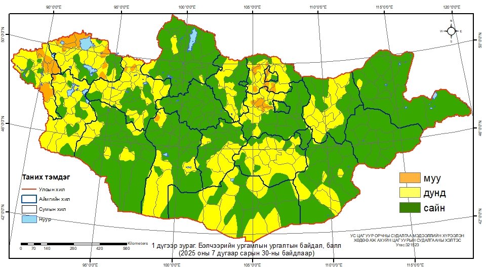 Шинэ мэдээБаян-Өлгий, Увс, Сэлэнгийн зарим нутгаар, Ховд, Завхан, Өвөрхангай, Дархан-Уул, Төвийн ганц нэг сумын нутгаар муу, Архангай, Говьсүмбэр Дорнод, Сүхбаатарын нийт, Говь-Алтай, Хөвсгөл, Дорноговийн ихэнх, Баянхонгор, Булган, Өвөрхангай, Төв, Өмнөговь зарим, Баян-Өлгий, Увс, Ховд, Завхан, Булган, Сэлэнгэ, Дундговь, Хэнтийн цөөн сумдын нутгаар хэвийн, бусад нутгаар дунд байна.