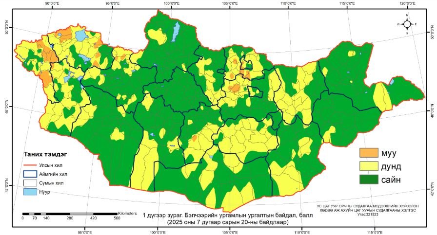 Шинэ мэдээБэлчээрийн ургамлын ургалтын байдал долдугаар сарын 20-ны байдлаар нийт нутгийн 37 хувьд гантай болон гандуу, 63 хувьд хэвийн байна.
