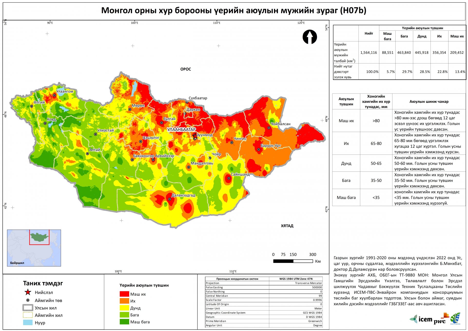 Шинэ мэдээХарин 28.5 хувь буюу 445.918 кв.км нь “дунд” гэж үнэлэгдсэн бол 35.4 хувь буюу 552.391 кв.км газар нутаг нь хур борооны үерт өртөх байдал “бага ба маш бага” түвшинд байна.
