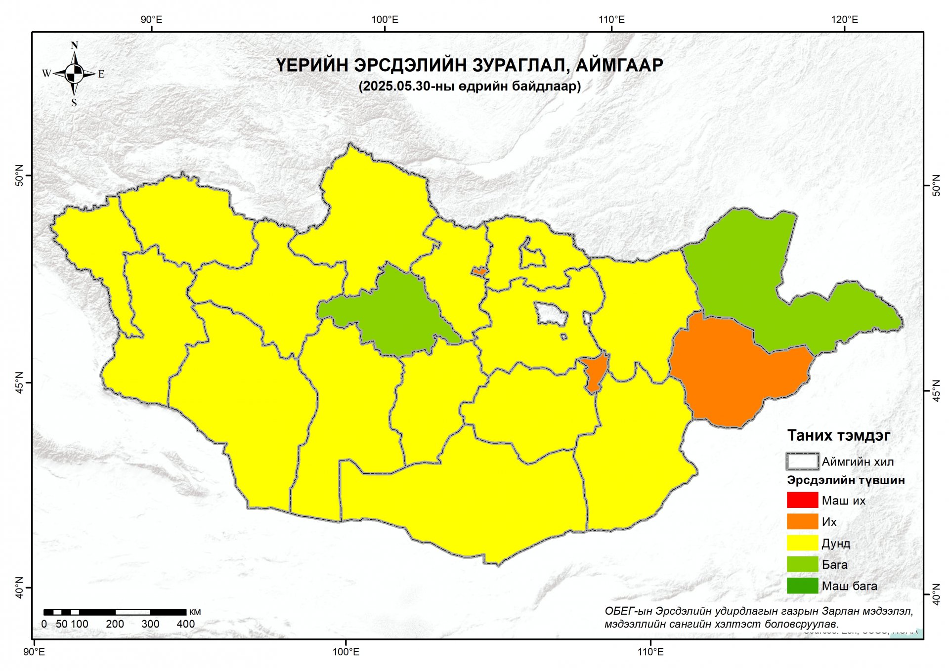 Шинэ мэдээМөн 21 аймгийн 330 сумын хэмжээнд маш их эрсдэлтэй 19 сум, их эрсдэлтэй 30 сум, дунд эрсдэлтэй 159 сум, бага эрсдэлтэй 94 сум, маш бага эрсдэлтэй 28 сум байна.