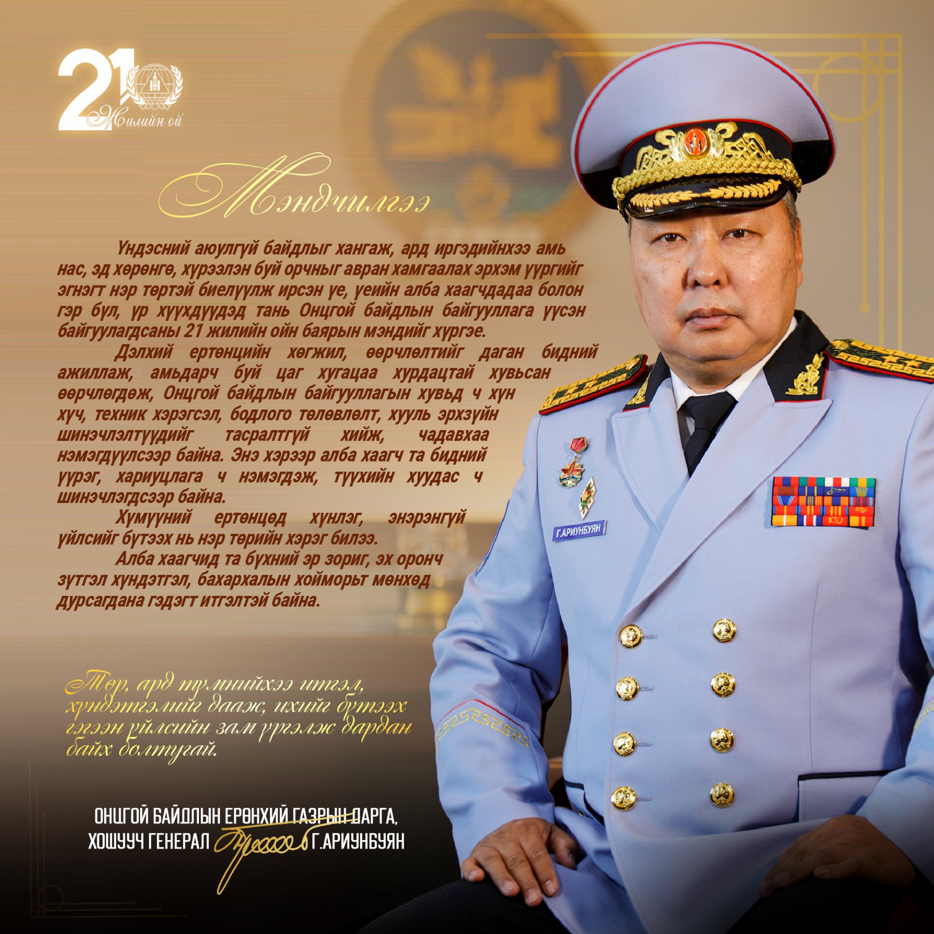 Шинэ мэдээОнцгой байдлын албаны түүхт 21 жилийн ойг тохиолдуулан ОБЕГ-ын дарга, хошууч генерал Г.Ариунбуян мэндчилгээ дэвшүүллээ.