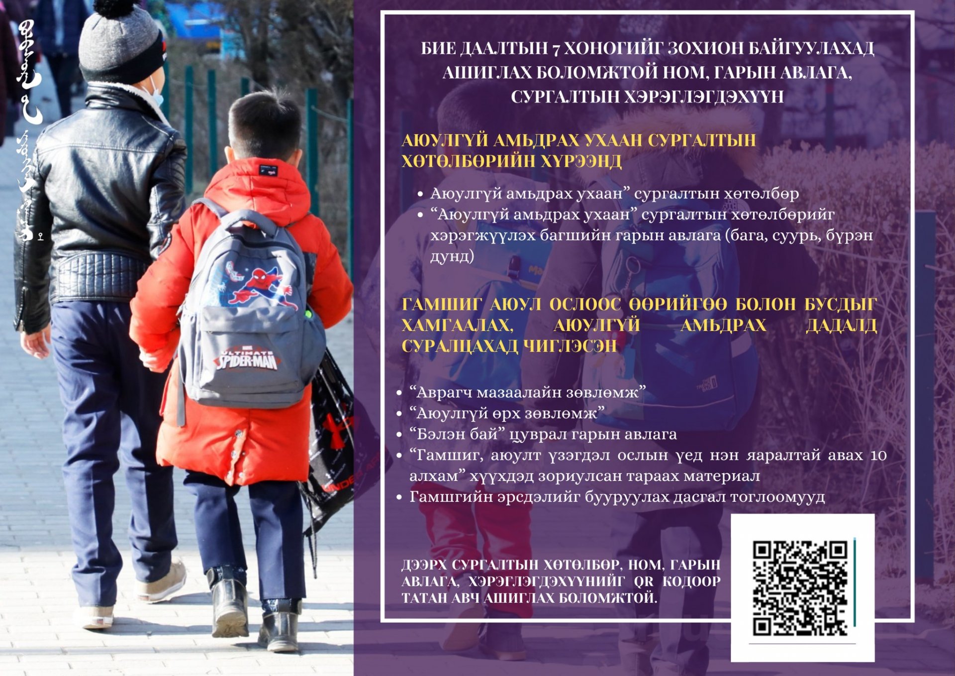 Шинэ мэдээЕрөнхий боловсролын сургуулийн II улирлын бие даалтын 7 хоногийг “Аюулгүй амьдрах ухаан” сургалтын хөтөлбөрийн хэрэгжилтэд дэмжлэг үзүүлэх хүрээнд Онцгой байдлын ерөнхий газар, Боловсролын ерөнхий газраас төв орон нутгийн Онцгой байдлын газар, хэлтэс, аврах ангитай хамтран зохион байгуулж байна. Энэ хүрээнд сургалтад сургалтад ашиглах боломжтой ном, гарын авлага, сургалтын хэрэглэгдэхүүнийг мэдээллийг хүргэж байна.