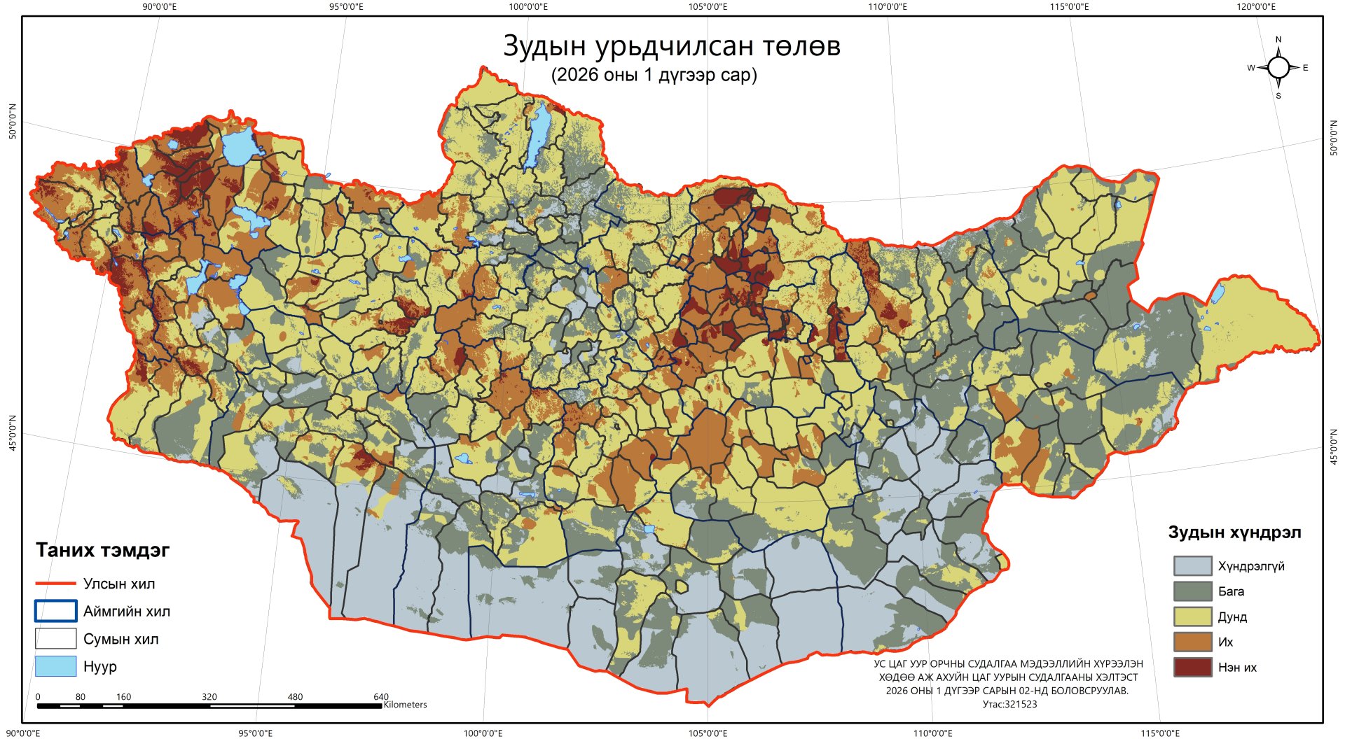 Шинэ мэдээНэгдүгээр сарын зудын урьдчилсан төлөвөөс харахад мал өвөлжилт нийт нутгийн 3 хувьд нэн их, 17 хувьд их, 38 хувьд дунд, 26 хувьд бага зэрэг хүндрэлтэй, харин 16 хувьд хүндрэлгүй байхаар байна.