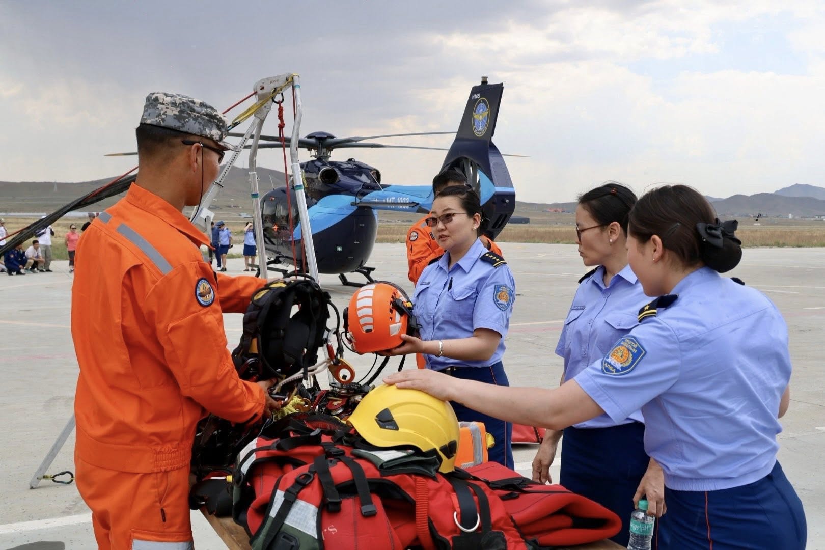 Онцгой байдлын ерөнхий газар, БНФУ-аас Монгол Улсад суугаа Элчин сайдын яам хамтран зохион байгуулсан “Нисдэг тэргээр эмнэлгийн яаралтай тусламж үйлчилгээ үзүүлэх сургалт, дадлагын үеэр ОБЕГ-ын Агаараас эрэн хайх, аврах 111 дүгээр ангийн нисдэг тэргээр өвчтнийг тээвэрлэх, буулгах дадлагыг хийлээ.