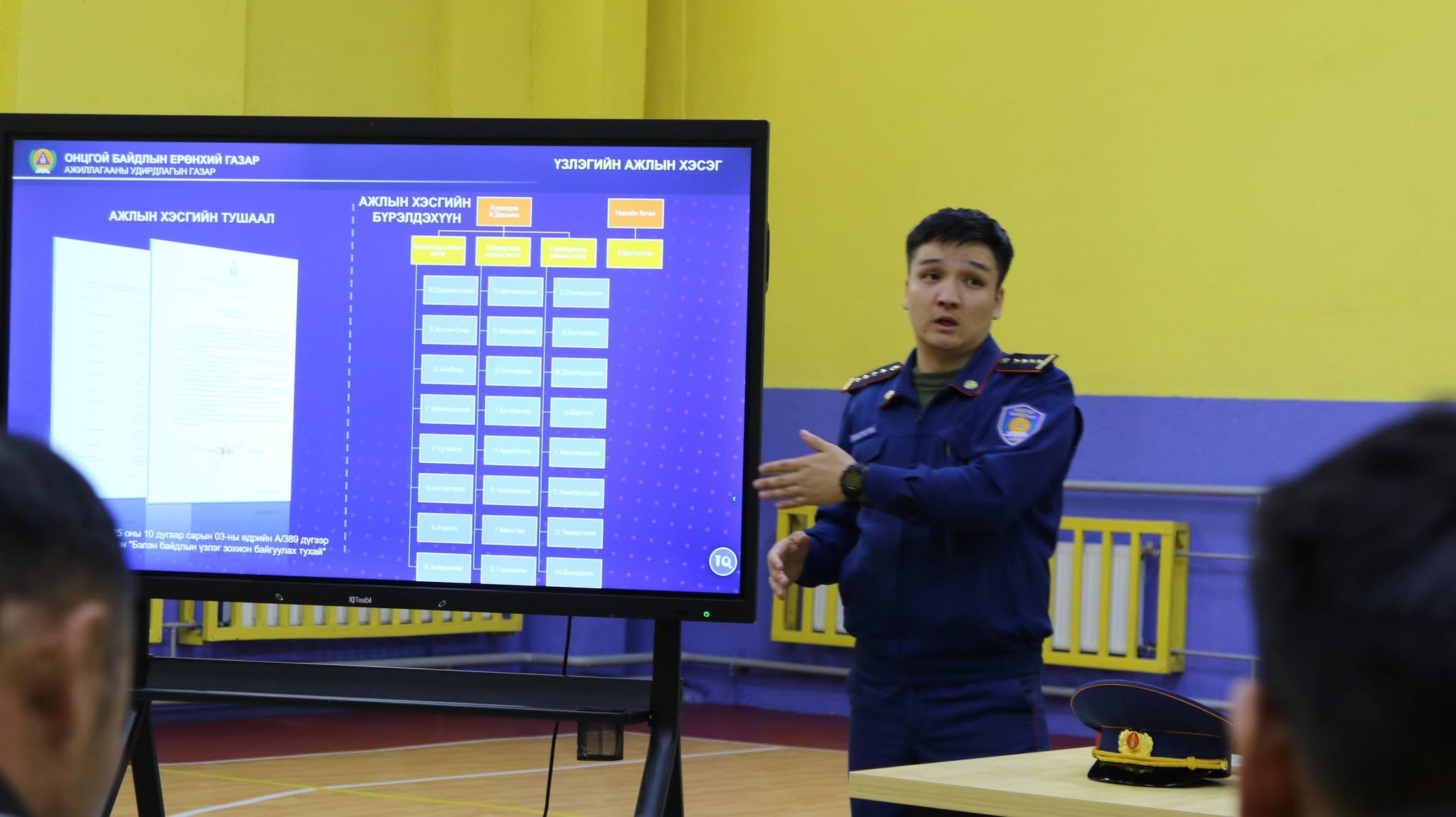 Алба хаагчид гамшгаас хамгаалах үйл ажиллагаа, бэлэн байдлын үзлэгийн зохион байгуулалт, улсын алба, мэргэжлийн ангийн чиг үүрэг, гамшгаас хамгаалах төлөвлөлтийн талаар танилцуулж, мэргэжил, аргазүйн зөвлөгөө өгч ажиллалаа.