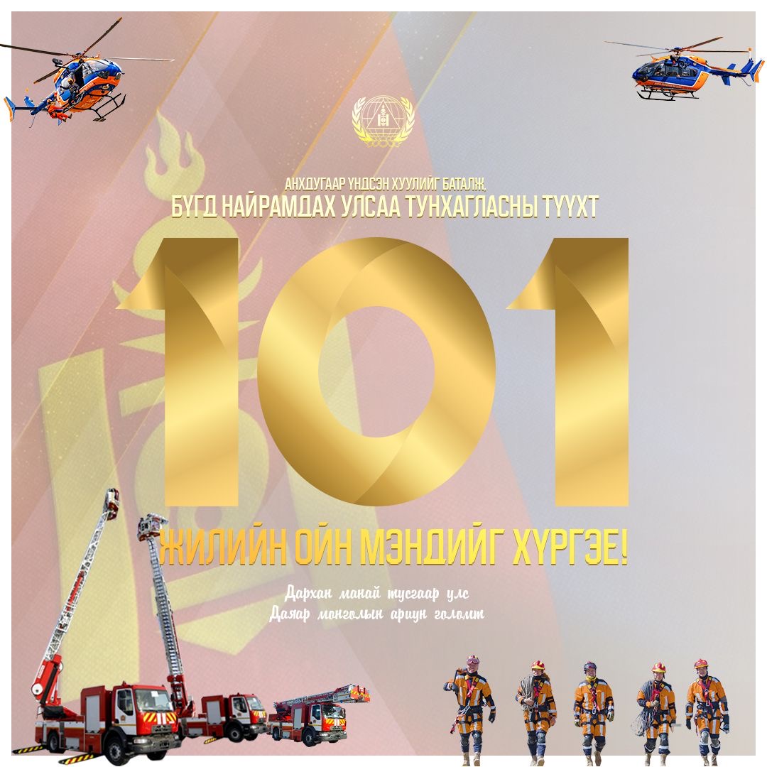 Тусгаар тогтнол, бүрэн эрхт байдлын бэлгэ тэмдэг болсон баярын энэ өдрөөр эх орон, ард иргэдийнхээ аюулгүй байдлын манаанд зогсож байгаа Онцгой байдлын байгууллагын үе, үеийн ажилтан, алба хаагч та бүхэндээ болон гэр бүл, үр хүүхэд, ард иргэддээ Анхдугаар Үндсэн хуулиа баталж, Бүгд Найрамдах Улсаа тунхагласны түүхт 101 жилийн ойн баярын мэндийг өргөн дэвшүүлье.