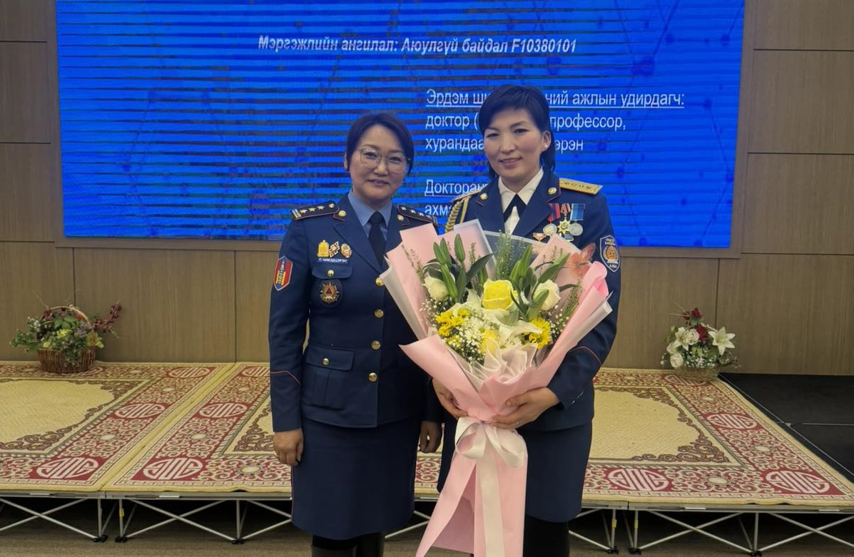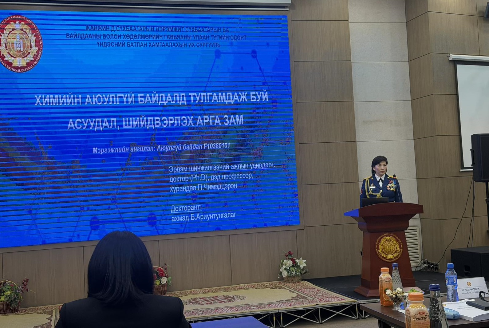 ОБЕГ-ын дэргэдэх Гамшиг судлалын үндэсний хүрээлэнгийн химич-судлаач, ахмад Б.Ариунтунгалаг “Химийн аюулгүй байдалд тулгамдаж буй асуудал, шийдвэрлэх арга зам” сэдвээр аюулгүй байдлын ухааны докторын зэрэг хамгааллаа.