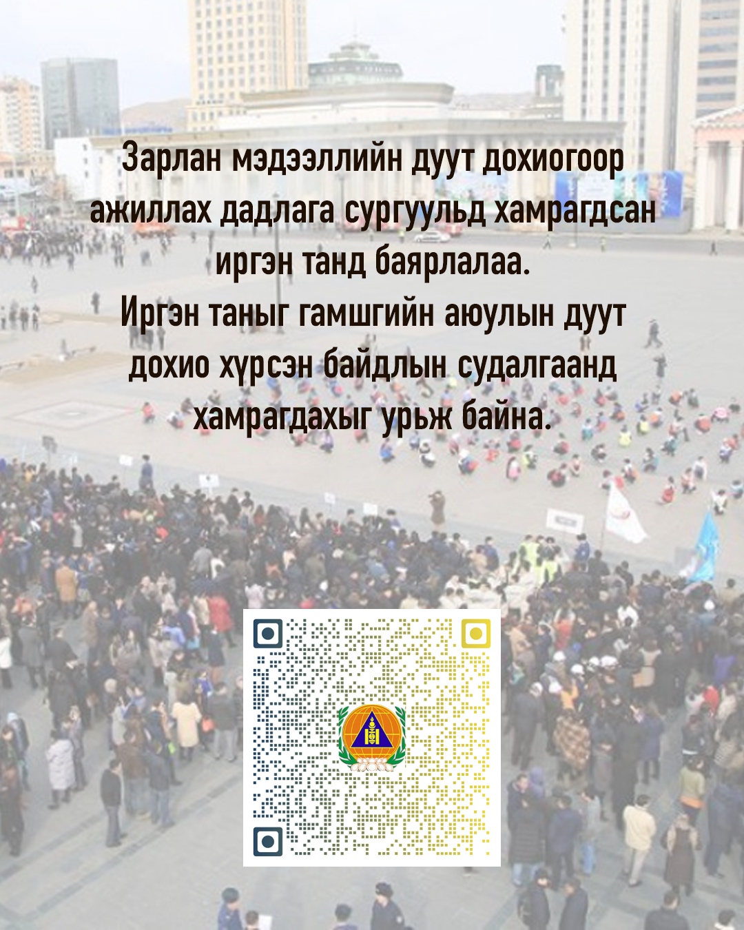 Шинэ мэдээЗарлан мэдээллийн дуут дохиогоор ажиллах дадлага сургуульд идэвхтэй хамрагдсан иргэнд танд баярлалаа.