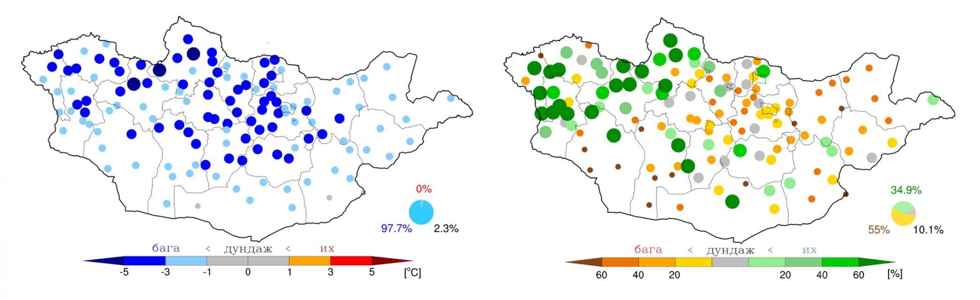 Сарын агаарын дундаж температурын олон жилийн дунджаас хазайх хазайлтыг авч үзэхэд нийт нутгийн 97.7 хувь нь дунджаас -1.1-ээс -6.1°С-аар хүйтэн, үлдсэн 2.3 хувь нь дунджийн орчим байжээ.